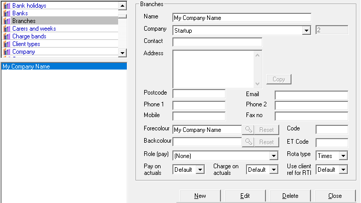 The rest of the fields allows for additional information to be entered, a useful one is the foreground and background colours so that you can easily see which carers/clients belong to a specific branch, this information is visible from the rota.